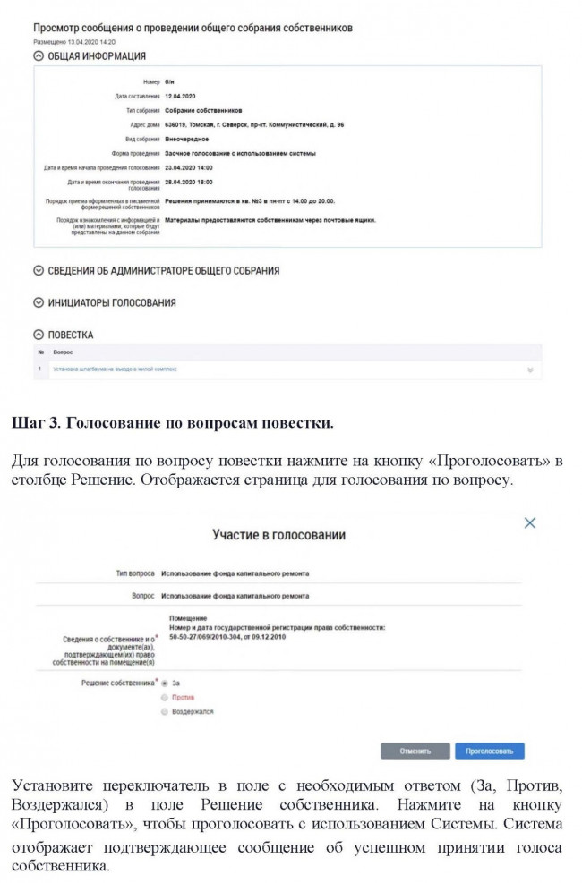 Для участия в голосовании необходимо войти в личный кабинет государственной информационной системы жилищно-коммунального хозяйства (ГИС ЖКХ) по адресу http://dom.gosuslugi.ru. Дополнительная регистрация не требуется, вход осуществляется через ЕСИА (единую систему идентификации и аутентификации) (пароль от портала ГОСУСЛУГ).